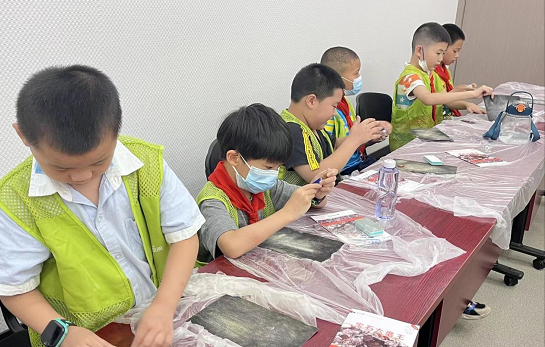 理论课结束后科技志愿者为每位小朋友发放科技包,在老师在指导下打磨各具特色的宝石吊坠,制作成一串串创意十足的宝石项链。