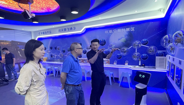 “你可以跟我讲:带我参观科技馆”来到科技馆门口,就有一个小机器人欢迎你的到来,它不仅能引导参观,还可以详细介绍科技馆的组成以及航空航天相关知识。