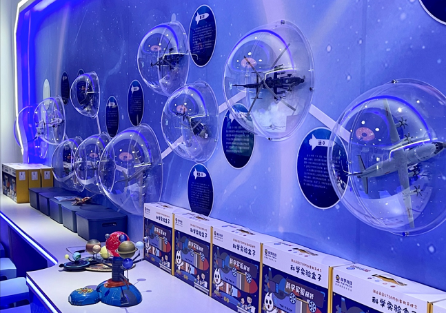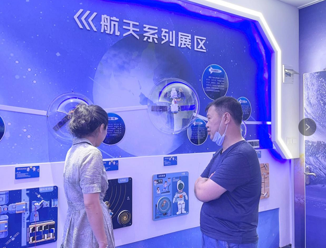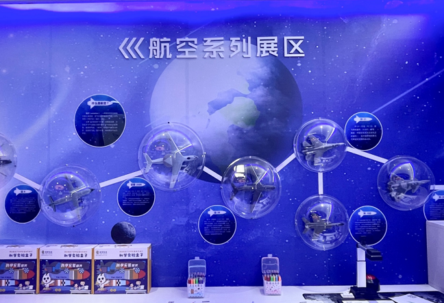 航空航天系列展区有许多的民用、军用飞行器模型,结合图文动画利用墙面进行展示,直观展示了中国航空航天业的发展与变迁。还可以动手操作体验可以拼装飞机、火箭、卫星及行星,在拼装过程中了解航空航天的知识。