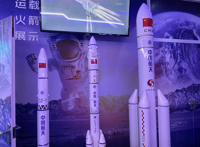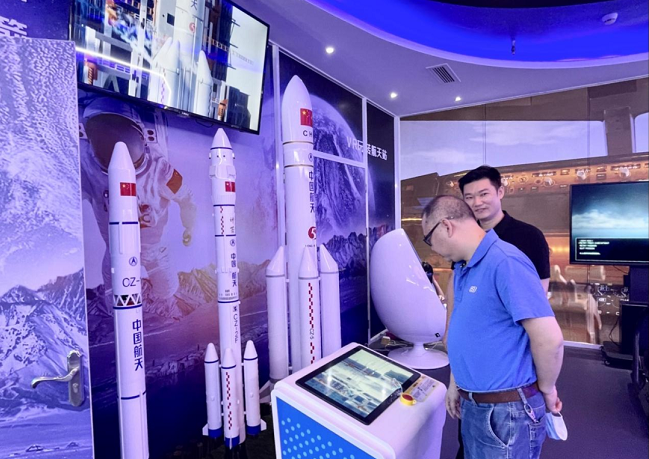 “10、9、8、7、6…”来到运载火箭展区,按下红色按钮,就能亲身体会到“发射火箭”的感觉。