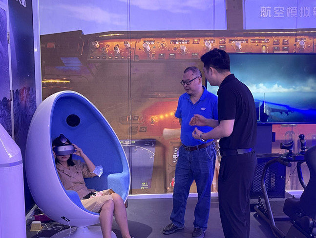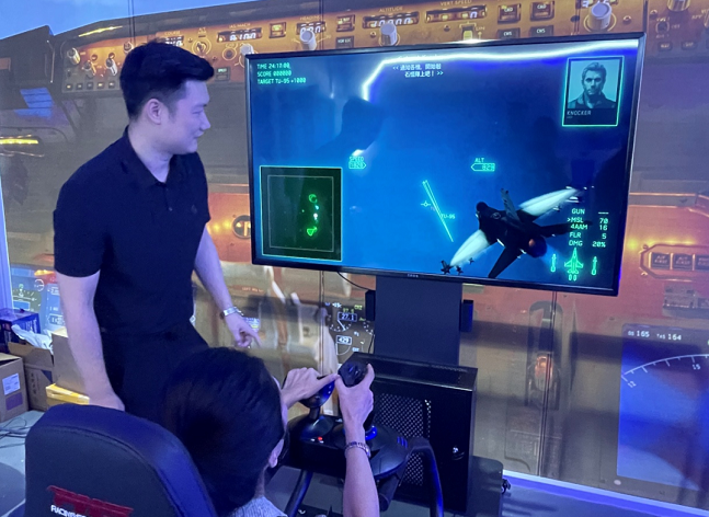 展馆左边有一个航空模拟驾驶器,坐上座位,可以驾驶你的飞机,躲避障碍,飞向万米高空。