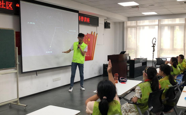 活动现场,博士生服务团的李洁宁化身为天文老师,采用科普图片展示和亲临其境体验形式,并结合通俗易懂的语言,向孩子们讲述了夏季大三角,北斗七星,太阳系八大行星等天文知识,激发出孩子们对浩瀚宇宙探索的兴趣,给孩子们带来了意蕴无穷的太空浪漫旅行。