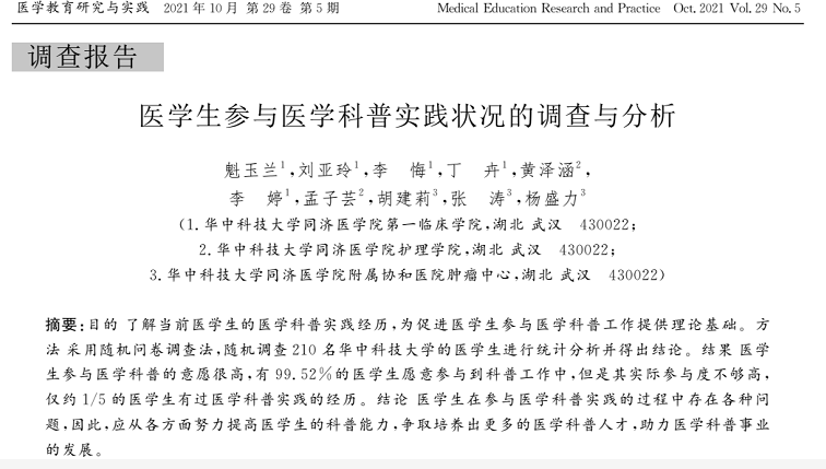 在团队创建的前期,杨盛力医生和华中科技大学第一临床学院的魁玉兰同学对华中科技大学在校的210名学生展开了问卷调查,发现有99.52%的医学生愿意参与到科普工作中,但他们实际参与度不够高,仅约20%的医学生有过医学科普实践的经历。