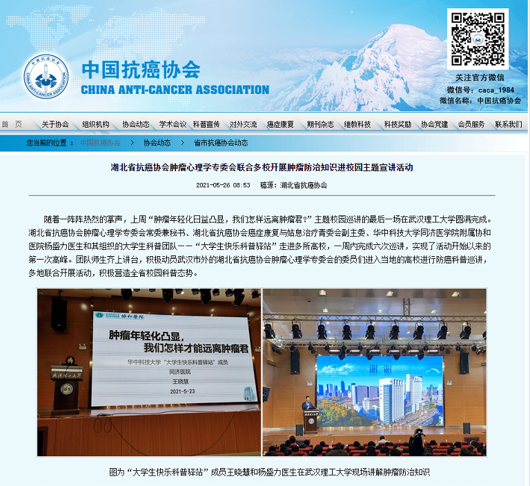 除了科普写作,杨盛力医生还非常重视提高大学生们的科普演讲能力、培养和锻炼医疗卫生科普人才,构建多功能团队。带着小伙伴们先后武汉城市学院、武昌职业技术学院、武汉体育学院、襄阳职业技术学院、湖北省中医药大学、湖北医药学院、荆州职业技术学院、武汉理工大学、湖北大学、武汉科技大学、三峡大学、湖北科技学院等16所高校,进行了健康科普讲座。