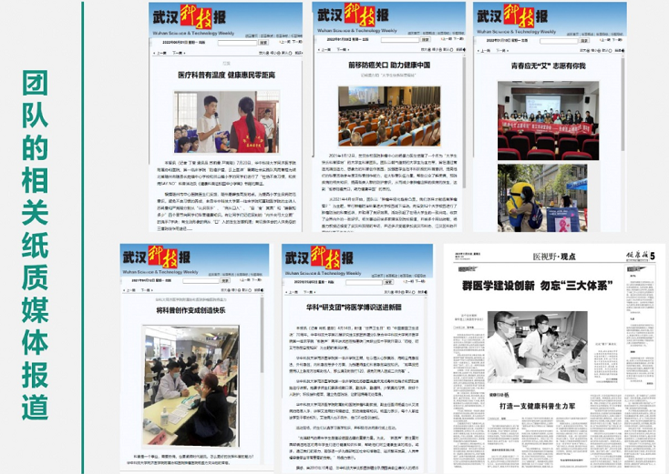 目前团队在《健康报》和《家庭医学》上发表科普文章7篇,另有超过50余篇科普文章和30份科普视频在学习强国、今日头条、人民日报客户端、中国抗癌协会肿瘤心理专委会、中国抗癌协会科普平台、湖北省抗癌协会、新浪网、长江日报长江网、腾讯网、武汉协和医院官微、江汉区科协官微、楚天科普等多个媒体平台刊出。团队已编撰两本科普书籍,分别为《肿瘤患者与家属心理健康100问》和针对中小学生的《健康科普进校园》。其中《健康科普进校园》便是实践队基于云调研、云课堂、实走访等形式,聚焦当前乡村健康知识科普的现状与需求,精心编撰了图文并茂的科普图书,共25个章节,涵盖了乡村常见疾病及常见癌症等相关内容。