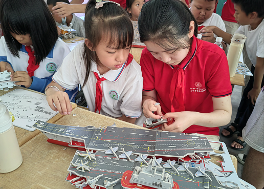 为了让小朋友们更直观、全面地了解我国的航空航天成果,同时锻炼动手实践能力,航空航天学院实践队带领蚂蚁堆中心完小的同学们一起完成辽宁舰、“玉兔号”月球车、“长征系列”运载火箭模型与水火箭的制作。随后,同学们观摩了固体火箭模型发射,并在实践队员们的带领下,依次发射了水火箭。看着自己亲手制作的水火箭成功冲向蓝天,同学们欢欣鼓舞,激动万分,纷纷表达对航空航天科普活动的乐趣与喜爱。一颗颗关于科技梦、航天梦的种子在心中悄然种下。