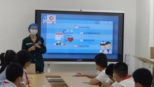 “两类人群最容易患热射病,一是在高温、高湿环境下工作、锻炼的人,二是体质较差的老人、小孩、产妇等。”近期持续高温,急诊科张娜医生为孩子们讲解了热射病的危险性、应急处置知识以及预防方法等。张娜医生提醒孩子们,当夏季出现头晕、恶心、口干、迷糊、胸闷气短等症状时应高度重视,立即移至阴凉通风处休息,喝一些含盐饮料,避免水和盐分的流失,病情严重的应立即到医院治疗。“孩子们,如果身边有人突发热射症,你们知道如何正确拨打120才能让救护车辆更快赶到现场吗?”带着问题,孩子们认真观看了八医院拍摄剪辑的“如何正确拨打120”教学片,不时将要点记录在笔记本上。