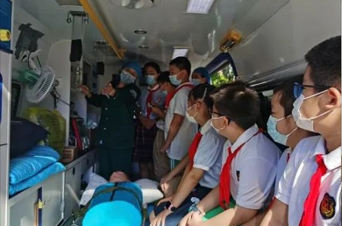 早上8时30分,9名“小小应急宣讲员”来到八医院急诊中心门口。中心彭医生推开一辆救护车的车门,邀请孩子们上车体验救护车的“秘密”。“热射病是最严重的中暑,是因高温引起的人体体温调节功能失调,体内热量过度积蓄,从而引发神经器官受损。”彭医生深入浅出地讲解了热射病的症状、危害以及在救护车辆上如何使用医疗设备进行急救,简单的演示和讲解让孩子们对热射病的知识更加深刻。