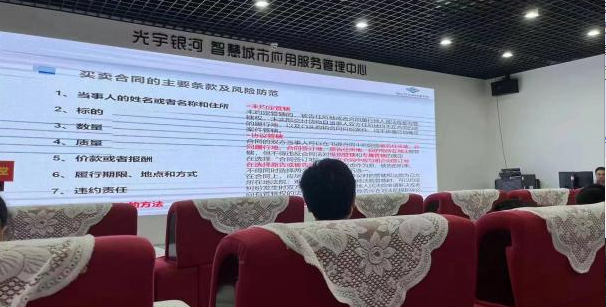 本次普法活动邀请了沙中心律师进行培训讲解。沙律师从前期摸底阶段、合同签订阶段、合同履行阶段、应收账款阶段等环节,详细讲解了各阶段企业所面对的风险,以及如何防范和规避、化解风险。沙律师在讲解中,运用通俗易懂的语言,结合一些公司在运营中碰到的典型案例,使公司领导和员工对公司经营中的风险有了进一步认识。同时,面对公司领导的提问和咨询,沙律师都给予了详尽的解答,公司领导和员工纷纷表示收获满满。