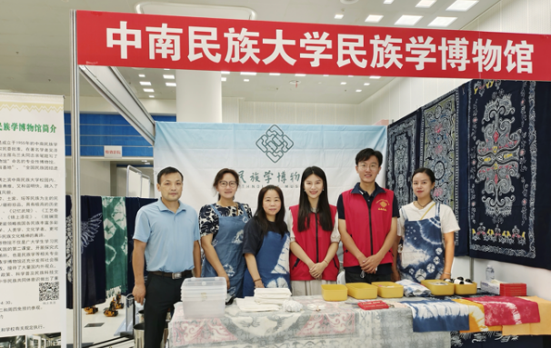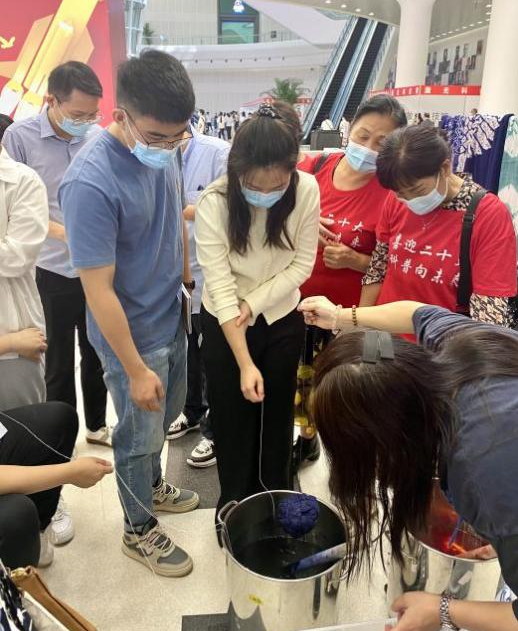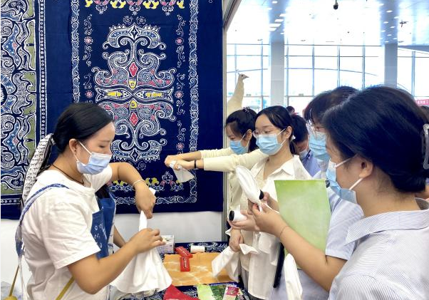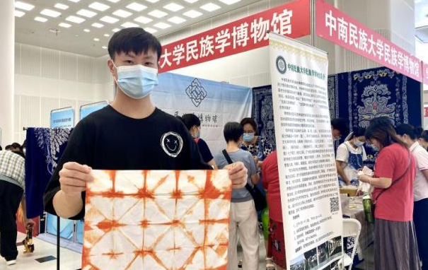 活动现场,民族学博物馆志愿者队伍带来了扎染工艺品和扎染体验。扎染是中国民间传统而独特的染色工艺,分为扎结和染色两部分。它是通过纱、线、绳等工具,对织物进行扎、缝、缚、缀、夹等多种形式组合后进行染色,最终形成各种形状的花纹。扎染工艺品一经展出便吸引了大量游客驻足欣赏,大家纷纷惊叹民族传统手工艺技术的精湛与神奇。