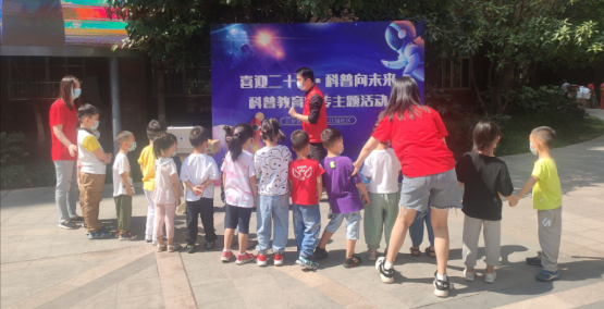 知识广场前,二十多名小朋友聚精会神的观看着科技志愿者老师的魔术表演,只见老师从一个空空如也的存钱罐里拿出一面面小旗子,神奇的景象一下子就点燃了同学们的好奇心。在同学们的呼喊声中,老师现场揭秘,给大家分发魔术小道具,科普魔术背后的科学原理。