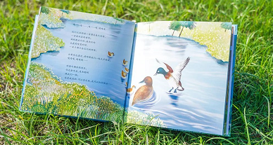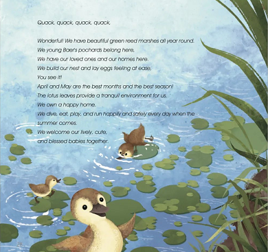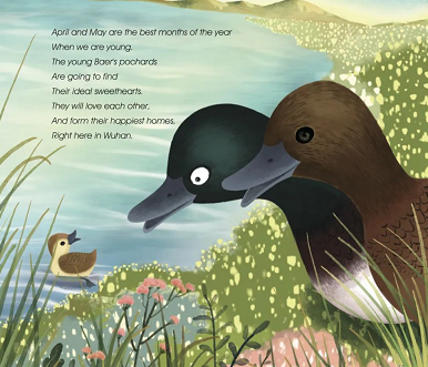 这本绘本名为《嘎嘎嘎,我们喜爱武汉——亲爱的,我们是青头潜鸭》,以武汉青头潜鸭为原型,讲述了全球极度濒危物种、国家一级保护野生动物——青头潜鸭在百湖之市、湿地之城栖息、定居、繁衍的故事。