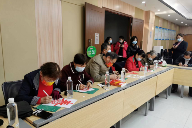 剪纸是一种用剪刀或刻刀在纸上剪刻花纹,用于装点生活或配合其他民俗活动的民间艺术。活动开始工作人员为居民们发放红纸、剪刀、刻板、刻刀等工具后,此次选择制作“春”和“福”字剪纸,通过现场工作人员细心指导后居民们很快便上手了,“这个地方怎么剪呀?”“你的步骤错了,你看要先这样剪。”“您这个花纹刻得真好。”......现场居民互相学习,相互帮助,气氛相当和谐愉快。