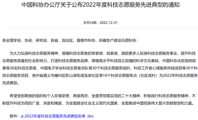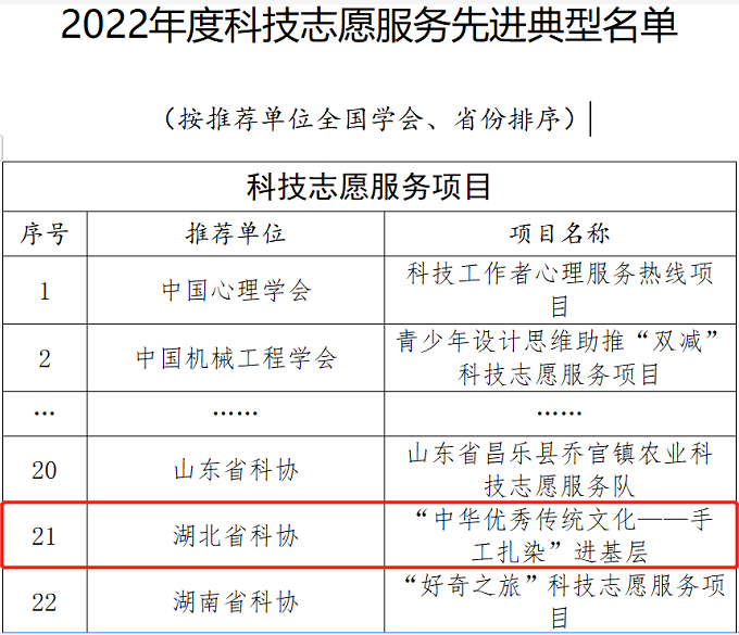 近日,中国科协官网公布2022年度科技志愿服务先进典型名单,共100份推荐典型事迹入选先进典型。经湖北省科协推荐,洪山地区科普展教联盟成员单位——中南民族大学民族学博物馆科技志愿服务项目“‘中华优秀传统文化——手工扎染’进基层”获评为2022年度中国科协“科技志愿服务项目”先进典型。