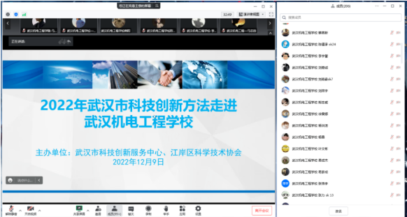 为培养创新型人才,提升创新能力,将创新意识培养的阵线前移,12月9日,由武汉市科技创新服务中心与武汉市江岸区科学技术协会联合主办,武汉市青年创新科技服务中心承办的2022年武汉市科技创新方法进校园系列活动武汉机电工程学校专场在线上举办,150余名学生参加了培训。
