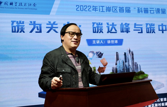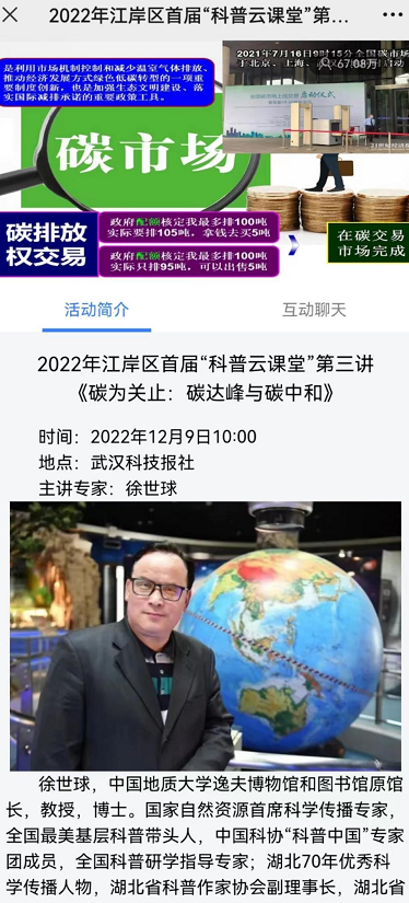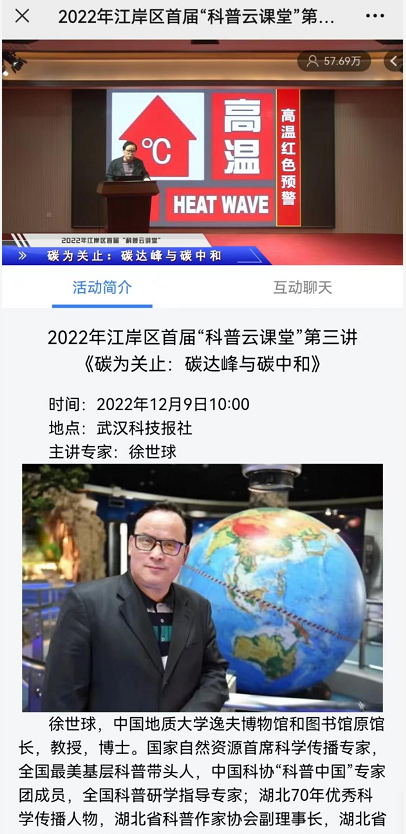 为了更好地让民众了解碳达峰、碳中和“双碳”目标,切实提高民众的节能减排意识,12月9日上午10点,2022年江岸区首届“科普云课堂”第三讲正式开讲,此次科普云课堂特邀国家自然资源首席科学传播专家、中国科协“科普中国”专家团成员徐世球作为主讲嘉宾。以《碳为关止:碳达峰与碳中和》为题,徐世球从一“碳”究竟、双“碳”目标、三“碳”责任三个方面,生动地介绍了碳排放的产生及危害,碳达峰与碳中和的科学内涵及实现途径等内容,多维度分析实现碳中和的重要意义,为大家带来了一场精彩的科普盛宴。