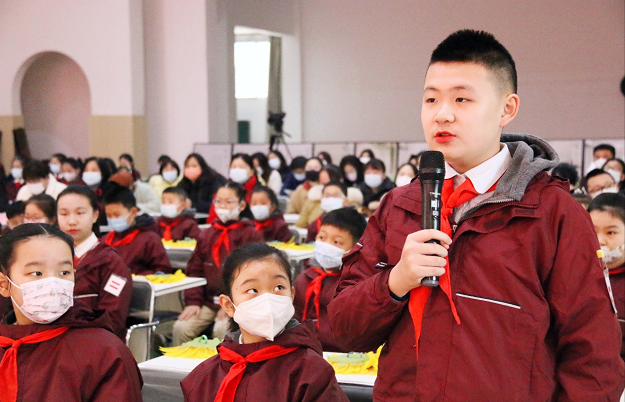 “第一课”上,中山路小学的少先队们自信展现社团成果:民乐社团演奏《楚韵》、驾驭未来“车模”社团、科创社团《智慧炫舞》,最后少先队员代表以诗朗诵《乘风破浪向未来》,向周巍老师这样的中国脊梁们致敬。