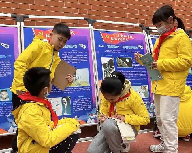 记者在现场看到,从东方红一号成功升空,到神舟十三号载人火箭发射……展览图文并茂地集中展示和宣传了我国航天事业60年来取得的成就。学生们一边观看展板,一边聆听老师的介绍。大家被眼前的“大国重器”深深吸引,自豪之情油然而生。“看了这次展览,我学到了许多知识:原来火箭上天时会脱落一些用于推进的组件。我深深感受到了我国探月工程的伟大,进一步明白了伟大事业都基于梦想,探索浩瀚宇宙,和平利用太空,是全人类的共同梦想!”鄱阳街小学四(3)班的张世航表示,希望以后还有这样精彩的参观活动。