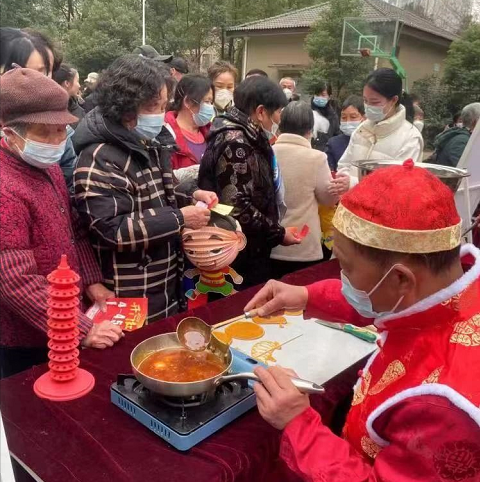 喜迎佳节,从张家湾街道建材社区的舞狮开始,活动现场,不少居民被铿锵有力的鼓点、活灵活现的“狮子”所吸引;生动有趣的川剧“变脸”吸引着小朋友们与演员互动,不少居民们拿出手机记录下这精彩瞬间;张家湾街道长征社区邀请非遗传统技艺师大展身手,在宫灯传统技艺师的示范下,家长和孩子通过一步步的固定、组装、粘贴,一起亲手做宫灯;非遗传承老师凝神静气,以勺为笔,以糖为墨,运腕走勺。只见他用小汤勺舀起熔化了的糖汁,一放一收,一顿一抖,短短十几秒,一只栩栩如生的福兔悄然成趣。现场的小朋友们看着老师娴熟的技艺,纷纷惊叹;接下来是张家湾街道紫云府社区的观花灯猜谜语,猜灯谜又称打灯谜,是中国独有的民俗文化活动形式,居民你一言我一语,互相提示讨论,现场洋溢着欢乐、祥和、喜庆的节日气氛;长江社区的活动现场,老师为孩子们讲解了草的种类以及草编的由来及发展,向大家展示了草鞋、草帽、扇子、蛐蛐等编织作品,并带领小朋友们投入到草编蛐蛐的制作当中。剪纸区域,老师手把手地教导大家,孩子们按照老师的步骤,三两下剪出了一只可爱的小兔子,每个人脸上都挂满了新奇的笑容。面塑区域,小小的面团经过捏、搓、揉、掀,仿佛在老师手中“活”了起来,成了一件件灵动的艺术品。