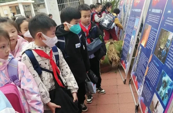 这是青山区科协携手青山区教育局,在钢花小学开展的“致敬中国航天”主题图片展,现场学生反响强烈。