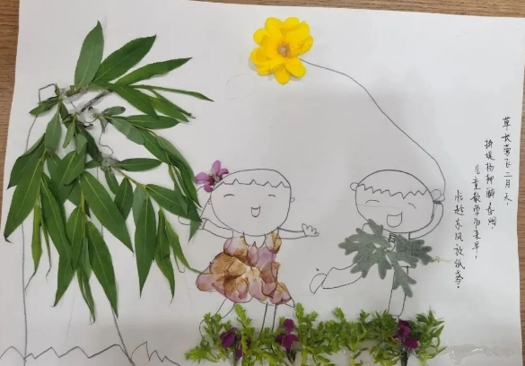 一场春雨过后,社区里散落了不少树叶和花瓣。在社区工作人员的带领下,小朋友们将掉落的树叶和花瓣统一收集起来,准备动手制作植物标本。