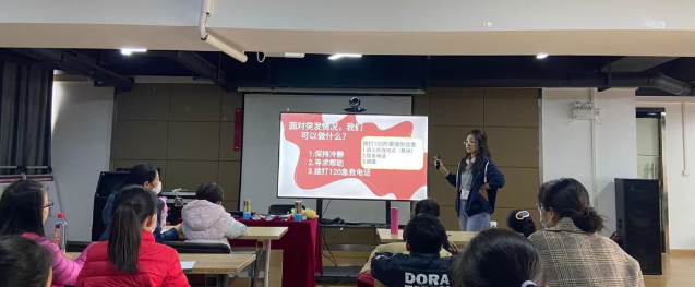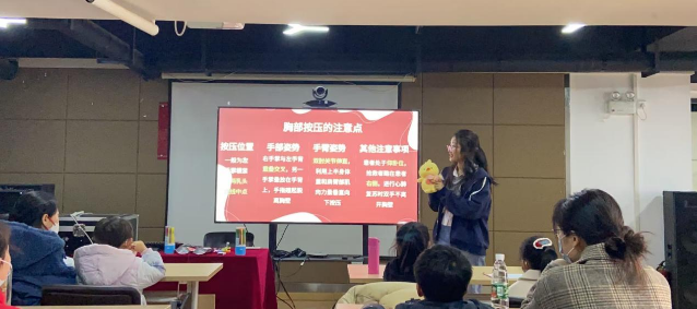 3月25日下午,中南路街道星海社区不时传来孩子们的声音“我来”、“我知道”,走进一看,孩子们踊跃地举手和科普志愿者老师进行互动——“面对突发情况,我们可以做什么”,来自华中师范大学的科普志愿者向孩子们普及了心肺复苏,包括胸部按压、人工呼吸和体外除颤,并指导小朋友自己动手进行胸部按压的实践。