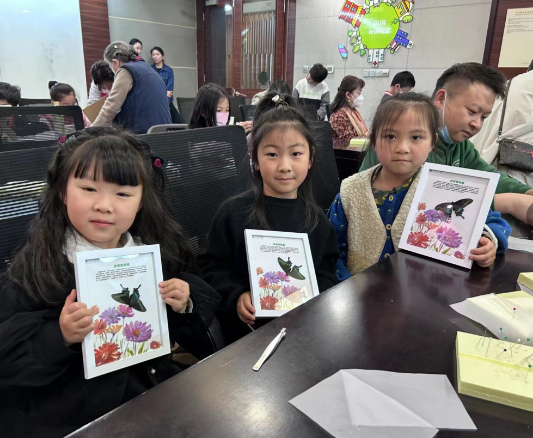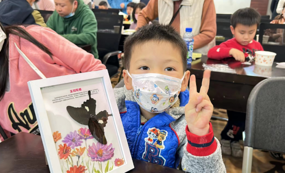 在大家最喜欢的标本制作环节中,志愿者老师们为每位小朋友发放一套蝴蝶标本材料。小小科普爱好者们按照老师的提示小心翼翼的将蝴蝶调整好位置后,用大头针固定蝴蝶身体,封闭好展示玻璃,一只漂亮的蝴蝶标本就制作完成了。大家都特别认真仔细的制作,有的家长也跃跃欲试,共做实验,享受这份难得的亲子时光。