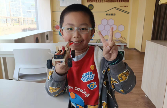 到了制作环节,老师取出材料包,分别讲解了每一份材料的作用和使用方法。孩子们拿到材料后,积极踊跃地参与制作,一件件成果在孩子们手中诞生,看到自己制作的风力越野车动起来,孩子们高兴地发出阵阵欢呼。