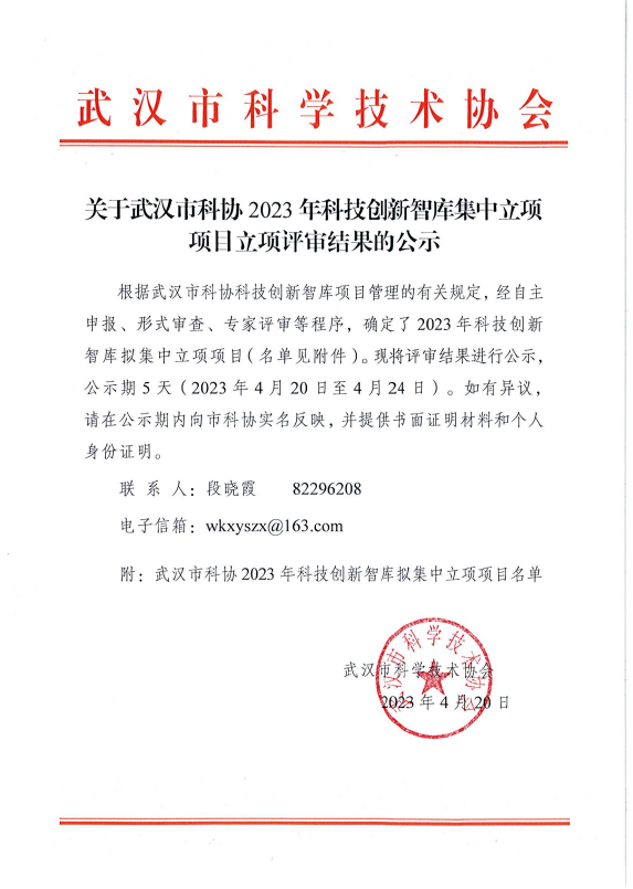 关于2023年科技创新智库集中立项项目立项评审结果的公示