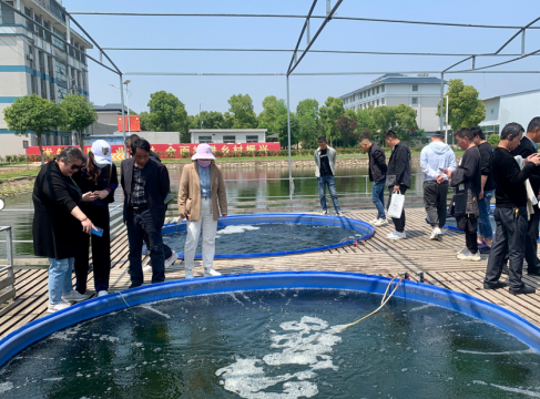 随后,活动走进湖北省现代农业展示中心。步入园区,道路两旁有序排列的池塘映入眼帘,这里是“零排放”圈养绿色高效循环养殖技术示范基地,池塘中的悬浮水池养着观赏锦鲤、鲈鱼等鱼类。据科普讲解员彭睿介绍,池塘零排放圈养绿色高效循环养殖技术,是由华中农业大学水产学院何绪刚教授科研团队研发并推广的新技术。该技术是在池塘中构建圈养装置把养殖对象圈在圈养桶内养殖,通过圈养桶特有的锥形集污装置高效率收集残饵,粪污等废弃物,废弃物经吸污泵抽排移出圈养桶,进入尾水分离塔,固废在分离塔中沉淀分离,收集后进行资源化再利用,去除固废后的尾水经人工湿地脱氮除磷后再回流池塘重复使用,实现养殖尾水的“零排放”。通过该项技术,精养池塘可达到单产1万斤/亩以上,年纯利润4万~8万元/亩。