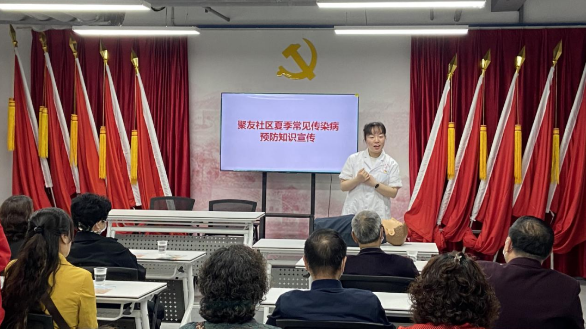 夏季气温渐渐回升,正是多种传染病易发的季节。为了普及疾病预防知识,帮助居民了解夏季常见传染病的症状及预防方法,提高居民防病和自我保健意识,红卫路街聚友社区联合武汉市第九医院开展“改正陋习讲卫生--夏季传染病预防”健康科普宣传活动。