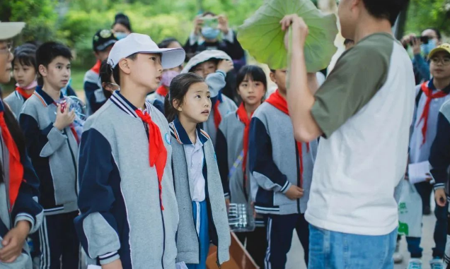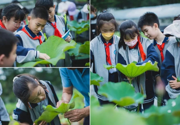 田田荷叶间,学生分组认真观察着植物的叶鼻和根系,兴奋地指认蜻蜓、瓢虫、蚜虫等那些他们已经熟悉的昆虫朋友,享受着初夏的清爽,记录着自然的笔记。