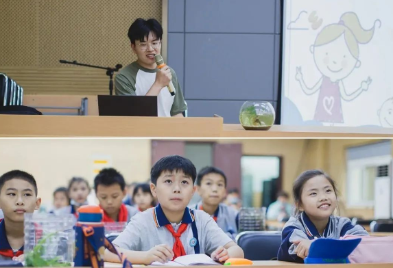老师带着大家采集了水草与石子,来到室内准备制作水生生态瓶。王宁迪讲解了生态系统相关知识,强调一个良好的生态系统一定是生物与生物、生物与环境之间相互影响、相互制约,并相对稳定的动态平衡状态。孩子们兴致高昂,动手实践,将水草、砂石、水、小鱼等元素一一放入,打造自己的专属生态瓶。兴之所至,更是奏乐高歌,合唱起了荷塘版《挖呀挖》,欢乐的旋律跃动在每一个人心尖。