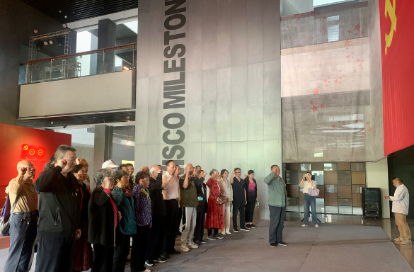 在武钢博物馆大厅处,离退休老党员们整齐列队,由支部书记李宗跃领誓,全体党员高举右手,庄严宣誓,重温入党誓词,“离岗不离党,退休不褪色”的党员初心与鲜艳的党旗交相辉映。