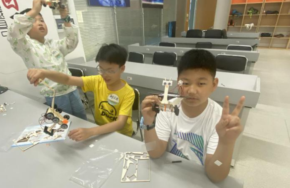 在学习了AI机器人工作原理之后,引导员感觉到了我们的小小探索者们跃跃欲试的眼神,于是给大家安排了一场学以致用的AI小车编程和火星探测车制作活动。动力履带车与无动力小车的编程,培养青少年在机械构造、电子电路、软件编程、智能硬件应用、传感器的应用、通信等方面知识能力和实践能力。而在火星探测车制作的过程中,则更多的需要青少年们分工合作,分别扮演设计师、工程师、技术员、使用者等多重角色。比如善于组织的孩子梳理设计要求、制定项目计划及人员分工;善于思考的孩子可以构思设计方案,善于制图的孩子可以绘制设计图纸,善于动手实践的孩子可以动手制作等等,每个成员都可以根据自己的特长,在项目中找到自己的定位。形成合理分工,完成每人的小礼物--火星车的组装与调试。最后在赛道上进行比赛,选出小组最佳成绩进行奖励。