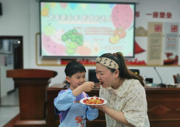 在本次活动中,家长只引导不包办,让孩子学习生存技能,培养自理能力,树立自信,为他们提供一个快乐的成长空间!同时,通过学习蔬菜科普知识,孩子们自行搭配合理膳食,制作出科学健康的营养美食。江岸区一元路小学一年级学生李拜天说:“参加这次活动,我学习到了营养搭配,并现场给妈妈做了一道番茄炒鸡蛋,请我的妈妈品尝。今天是母亲节,我想通过这道菜感谢妈妈。”