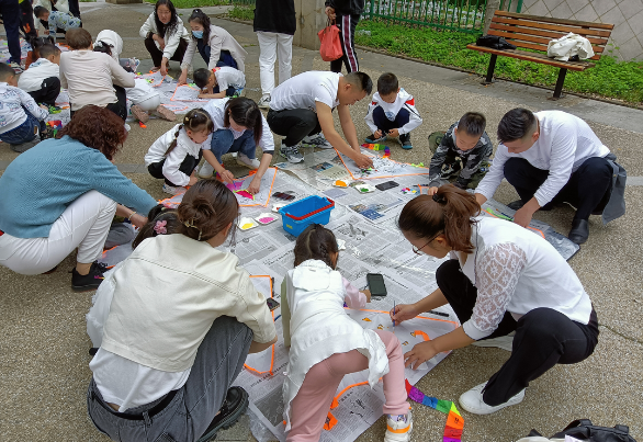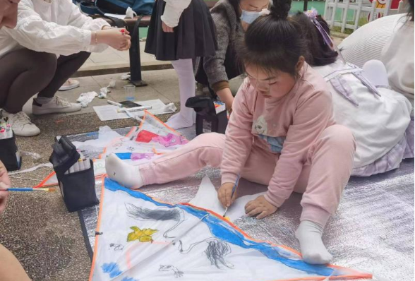 活动现场,志愿者们将准备好的风筝材料包、颜料、画笔发给小朋友们,小朋友们拿到材料包后,就迫不及待地和爸爸妈妈找地方动起手来。小朋友们的想象力和创造力都非常丰富,每个小朋友拿着画笔认认真真地在风筝上绘画,用自己稚嫩的小手创造出属于自己的美丽风筝。“我喜欢小猪佩奇,我画的是小猪佩奇一家人”“我画的是恐龙,吼~”“我画的是航天飞船,我要飞向太空”。