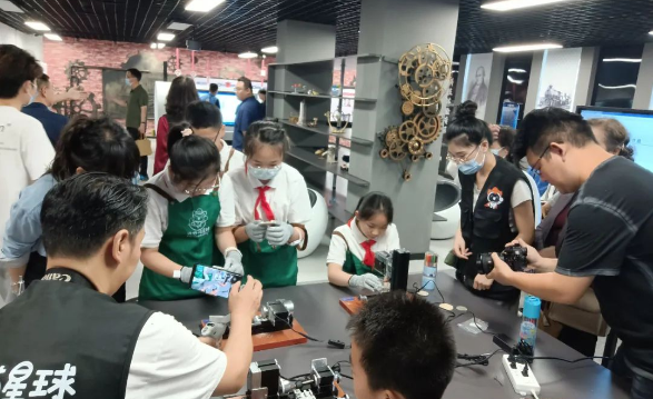 启动仪式结束后参观“大国重器”科普馆,通过讲解员的生动讲解,武昌区珞珈山小学学生代表配合机械手工实践区切割机床和磨床等互动沉浸式体验,制作小工艺品,让工匠精神深入人心。