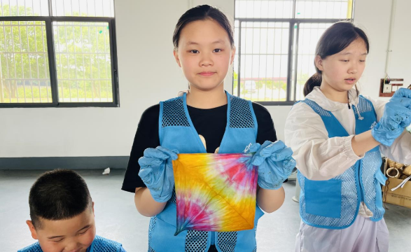 在本次活动中,老师还为在场孩子们讲解扎染的历史,详细介绍了扎染的工艺起源、基本知识、特点及制作技巧。扎染是中国民间传统而独特的染色工艺,是织物在染色时部分结扎起来使之不能着色的一种染色方法,是中国传统的手工染色技术之一,大家以白色手帕巾为底,用皮筋等工具将布料扎成各种形状,用来制作花纹。在扎和染的过程中,最细微的变化都能带来意想不到的效果,让人真正感受到扎染的魅力,各种图案产生自然晕纹,薄如轻烟,似梦似幻,若隐若现,韵味别致。当展开手帕,看到自己的扎染作品时,孩子们都不由自主发出赞叹之声。