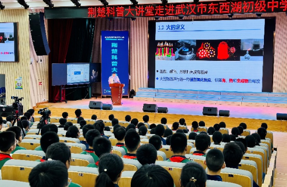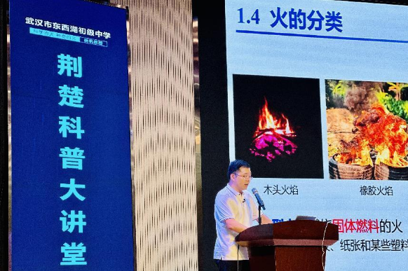 盛夏葳蕤,科普缤纷,6月25日,一场以《科学的火 神奇的火》为主题的科普大讲堂在武汉市东西湖初级中学拉开帷幕,中国地质大学(武汉)工程学院安全工程系特任教授、博士生导师胡帆为现场300余名师生带来一场别开生面的科普盛宴。