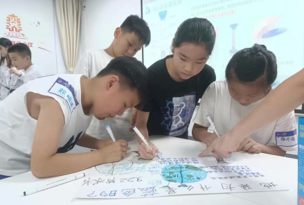在互动学习的过程中,各个小组的孩子们都不忘拿起手中的画笔,在小组长的带领下进行“水环境”的随堂笔记海报制作:有的小组成员负责绘画;有的负责整体海报布局;而有的则负责文字书写。孩子们各司其职,将课堂中学习到的知识有模有样地进行记录。过程中有的小组分工明确,而有的小组讨论不断,各抒己见,孩子们的踊跃发言让我们看到了新时代向日葵们的各种创意和想法。并且最终都通过海报画面进行了充分展示。