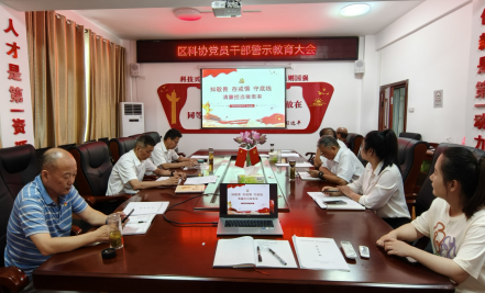 7月19日,区科协在机关会议室开展了7月支部主题党日活动暨党员干部警示教育大会,深入学习习近平总书记关于全面从严治党、加强党的纪律建设重要论述,部署区科协党风廉政建设“宣教月”活动,推进清廉机关建设。