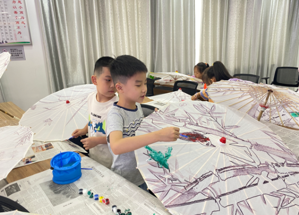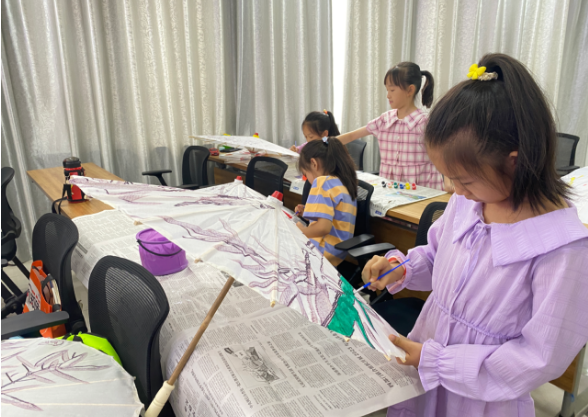 最后,志愿者给参加活动的青少年们每人发放了一把油纸伞半成品、颜料、毛笔和调色盘,让孩子们在伞面绘上自己喜欢的图案。