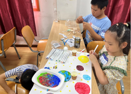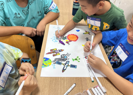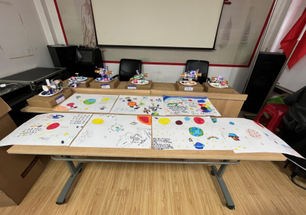 了解了这么多有关宇宙飞船的知识,孩子们迫不及待的想把这些知识用笔记下来,把脑海中的画面画下来,为了满足孩子们的想法,老师给每组成员发放了纸和笔,大家把心中最美的宇宙飞船画在了纸上,并且以 “大手牵小手”“大孩带小孩”的组队方式进行分组,每组都有一位哥哥或者姐姐,带着弟弟妹妹们动手实践,光画还不行,我们还要动手制作一搜宇宙飞船,还给飞船起了特别“动感”的名字。