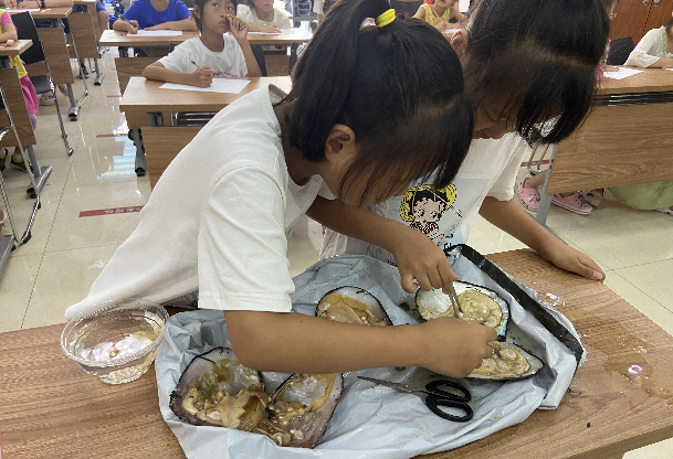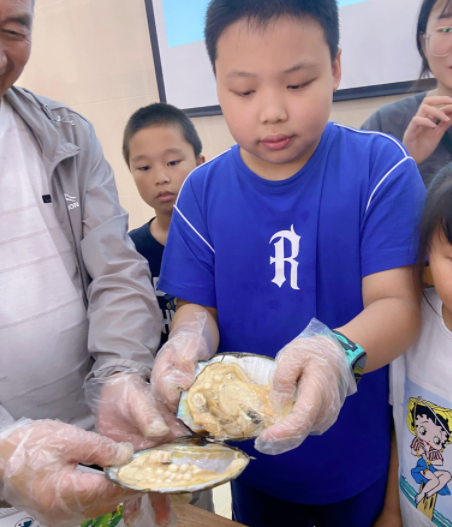 科普讲师在讲解完知识后,小朋友们进入了动手实践环节---开蚌取珍珠,制作珍珠项链。小朋友在家长和老师的陪同下自己动手开珍珠蚌,近距离观察蚌的内部结构,并自己动手绘制蚌的结构图,对蚌的内部结构有了更深入的认识。之后小朋友们制作了精美的珍珠项链。张宏烁小朋友说;“我要把我亲手制作的项链送给妈妈,她一定会喜欢的。”