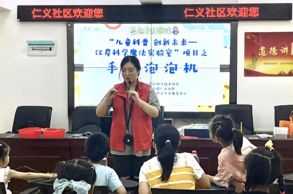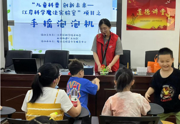 7月11日上午,为进一步拓展“武汉以我为荣”文明实践活动,提升青少年与同龄人之间的沟通交流能力,切实推进青少年科学教育事业全面发展,由江岸区科协、永清街道科协主办,江岸区新时代文明实践科学普及志愿服务队和永清街道仁义社区承办的“江岸科学魔法实验室-手摇泡泡机”科学魔术课程在仁义社区科技馆顺利举行,来自永清街道的青少年欢聚一起,共同感受科学的魅力。