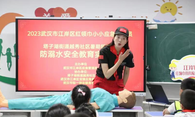 江城夏日酷暑难耐,溺水事故进入易发、高发期,为了切实增强青少年安全意识和防范能力,7月17日上午,江岸区塔子湖街道越秀社区携手区应急管理局在社区新时代文明实践站联合开展“红领巾小小应急宣传员”防溺水培训活动,共40余名暑期托管班青少年参加,并从中选拔10名孩子为“红领巾小小应急宣传员”赴辖区轻一健身游泳馆培训实践。