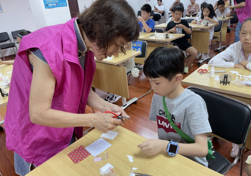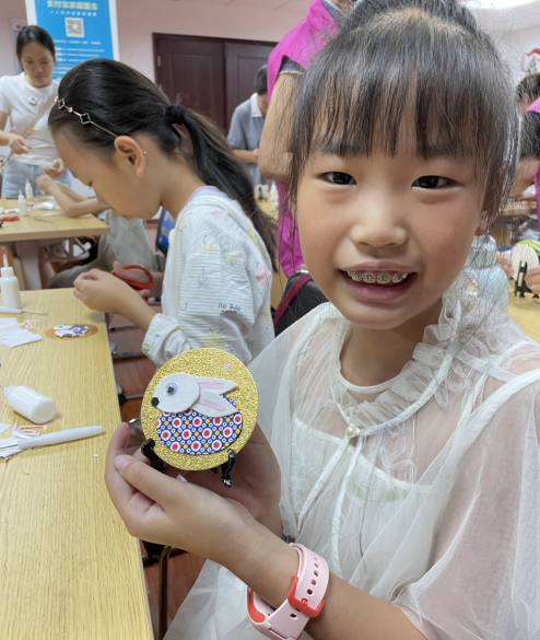 根据参加活动青少年的年龄阶段,本次活动制作主题是小兔子生肖摆件。在冯老师的指导下,小朋友们聚精会神听老师逐步讲解“生肖兔”堆绣的制作流程,很快就掌握了基本方法。修剪、粘贴,不一会儿,一个个灵动活泼、娇小可爱的“小兔子”逐渐成型,大家互相探讨、展示,现场氛围十分活跃。