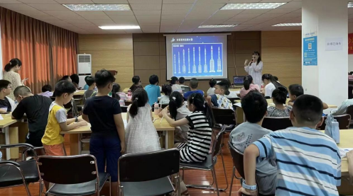 随后,在老师的深入讲解下,孩子们学习到导弹的研发之路的艰辛。中国科研人员勇于探索、自力更生的良好品质值得一代代人的歌颂和传承。从导弹的成功开始,中国科研人员紧接着研制出长征系列运载火箭。“你们知道为什么运载火箭上印有长征二字吗?”老师的提问再次引发孩子们的思考。“中国红军长征是人类历史上的伟大奇迹,为了学习长征精神,以此来书写记录中华民族茫茫探索宇宙的远征。”老师笑着解答道。