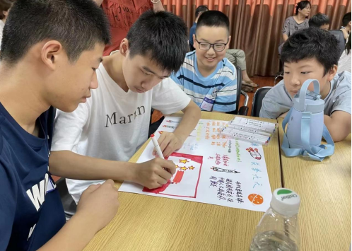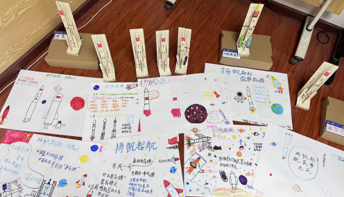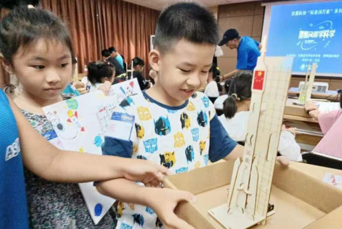 在火箭模型制作环节,在指导老师的教授下,孩子们分工合作,你拆零件,我来搭建,整个科普活动现场井然有序。不一会儿,大家就完成了火箭模型的手工制作。孩子们高兴地为自己的火箭取上专属的名称“梦想号”“东方亿号”“中国“捣”蛋号”等等。大家带着自己的作品和简报一起合影留念,现场参与活动的家长都拿起手机记录这一美好的瞬间。